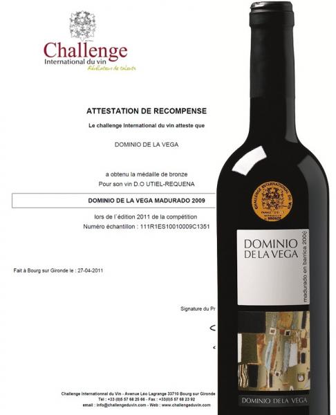 Dominio de la Vega has been awarded a Bronze Medal by The Challenge International Du Vin in its 35th edition held in Bourg (Bordeaux, France). During the competition, 4,624 wines from 35 countries were tasted by 768 judges, all of them specialists from the wine industry.